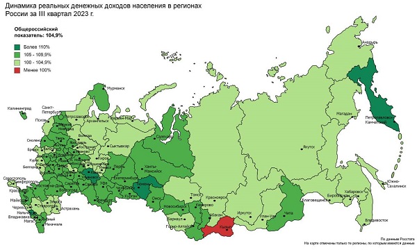 В лидерах также Тюменская область, Татарстан и Камчатка, где показатель равен 10-12%. Всего в Российской Федерации реальные денежные доходы населения в третьем квартале 2023 года выросли на 4,9%, что почти совпадает с темпами первого и второго кварталов (рост на 5%).