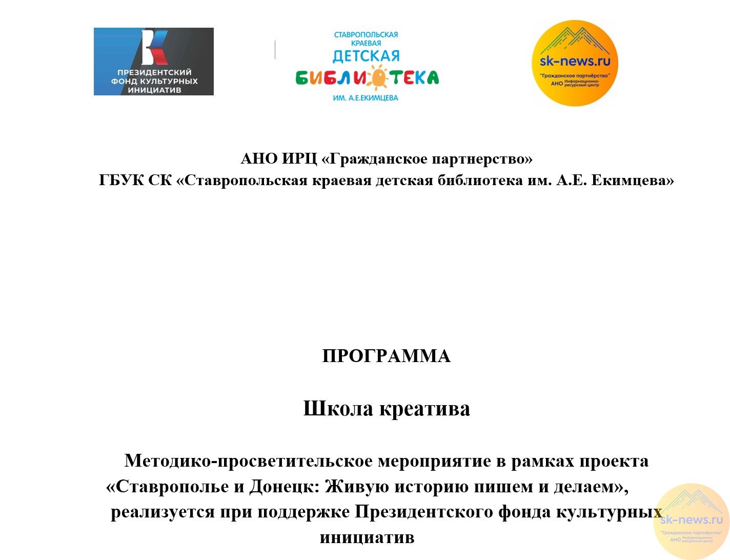 Они соберутся, чтобы подвести итоги специального проекта «Ставрополье и Донецк: Живую историю пишем и делаем», который при поддержке Президентского фонда культурных инициатив реализовала некоммерческая организация Информационно-ресурсный центр «Гражданское партнерство» в партнерстве с библиотечным сообществом.