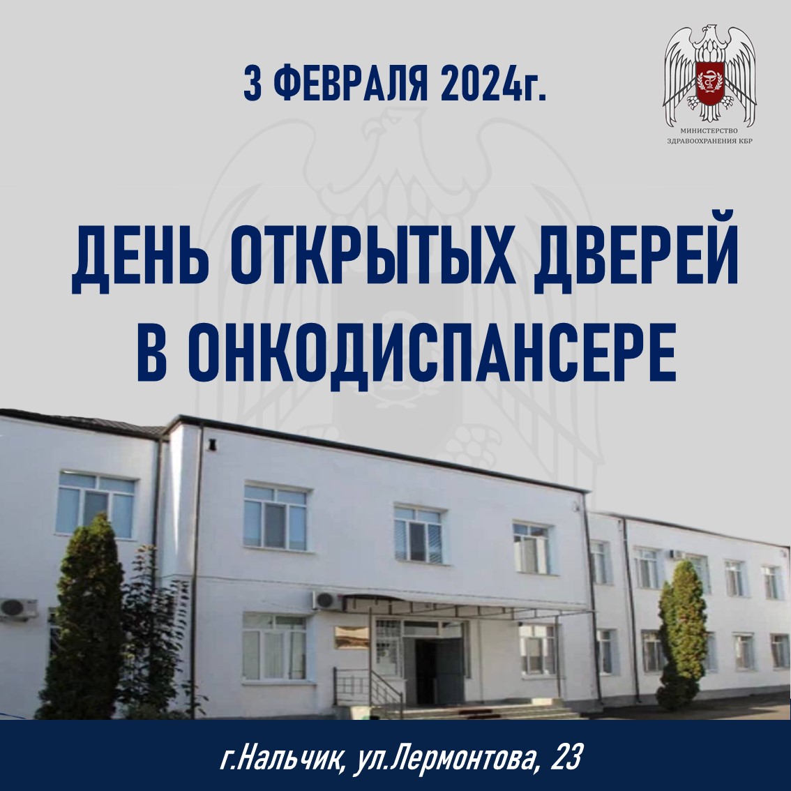 3 февраля с 8:00 до 12:00 в поликлинике Онкодиспансера по адресу: г.Нальчик, ул.Лермонтова, 23 состоится День открытых дверей, приуроченный ко Всемирному дню борьбы против рака